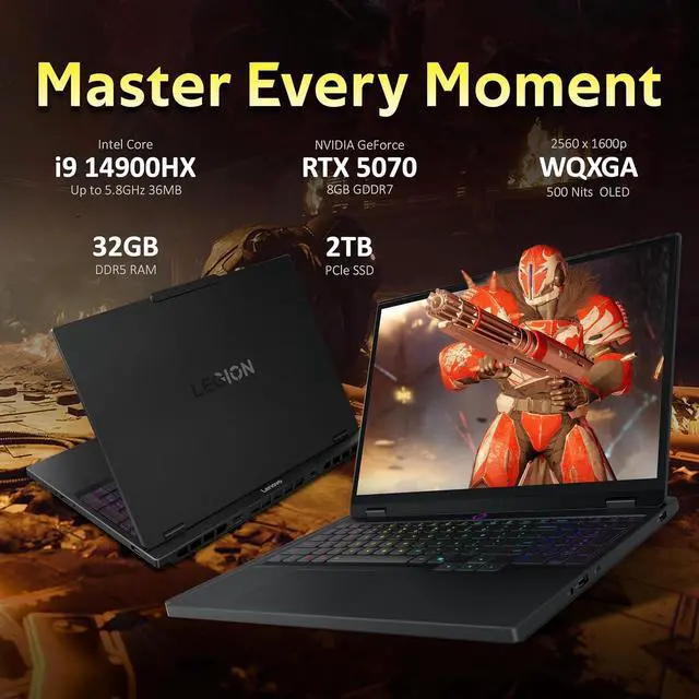 The Lenovo Legion 5 15.1" WQXGA 165Hz Gaming Laptop delivers powerful speed with its Intel Core i9-14900HX Processor and stunning, smooth visuals driven by NVIDIA GeForce RTX 5070 8GB GDDR7 Graphics, ensuring fast performance and an immersive high-refresh gaming experience.