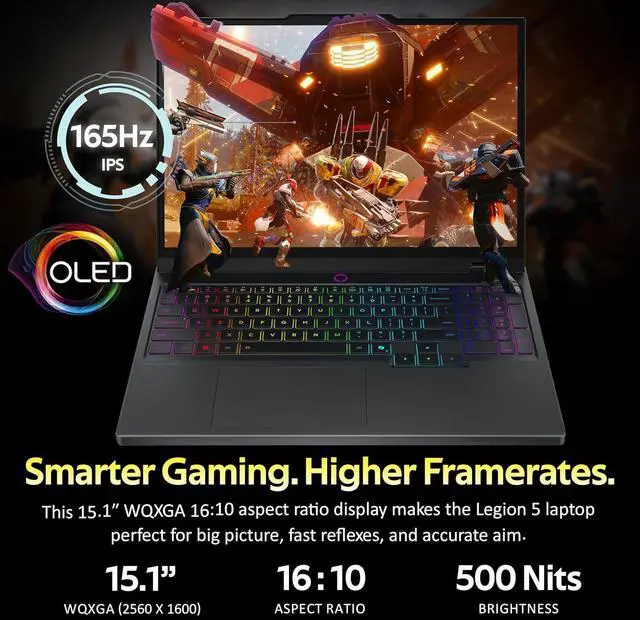 The Lenovo Legion 5 15.1" WQXGA 165Hz Gaming Laptop delivers powerful speed with its Intel Core i9-14900HX Processor and stunning, smooth visuals driven by NVIDIA GeForce RTX 5070 8GB GDDR7 Graphics, ensuring fast performance and an immersive high-refresh gaming experience.