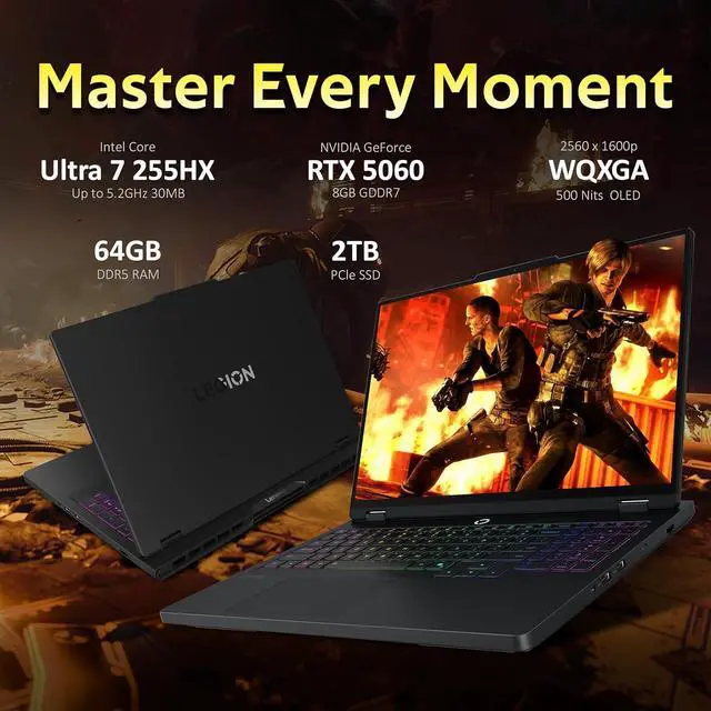 Lenovo Legion Pro 5i 16" WQXGA OLED 165Hz Gaming Laptop, powered by the Intel Core Ultra 7 255HX processor and NVIDIA GeForce RTX 5060 8GB GDDR7 graphics, delivers blazing-fast performance, stunning visuals, and smooth gameplay, making it perfect for immersive gaming and high-demand creative tasks.