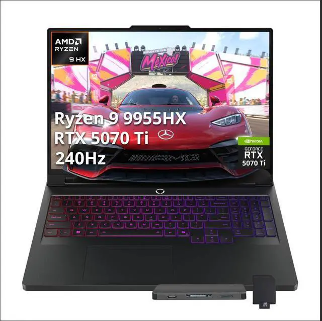 Lenovo Legion Pro 7 16" WQXGA 240Hz Gaming Laptop delivers ultra-smooth gaming and high-performance multitasking with the AMD Ryzen 9 9955HX processor, NVIDIA GeForce RTX 5070 Ti graphics, and a comfortable RGB backlit keyboard with numeric pad.