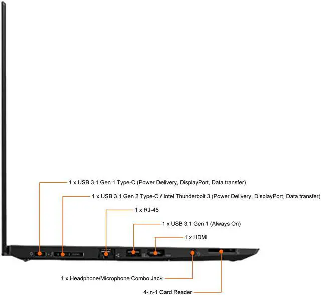- I/O Ports: 4-in-1 reader, 2x USB 3.1 ports (One Always On), 1x USB 3.1 Type-C Gen 1 for data/charging/display, 1x USB 3.1 Type-C Gen 2/Intel Thunderbolt 3, Headphone/Mic Combo Jack, HDMI 1.4 b, RJ-45 Gigabit LAN Port, Docking connection