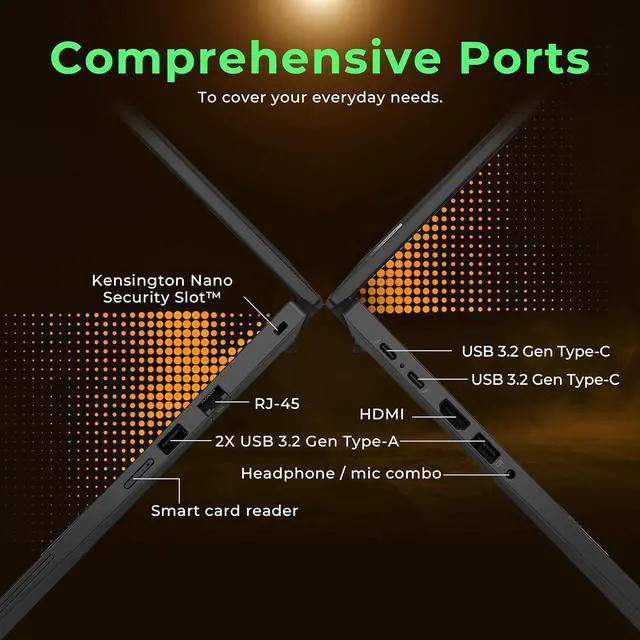 ^^Ports2 x USB-A 3.2, 2 x USB-C 3.2, 1 x HDMI, 1 x Headphone Jack, 1 x Smart Card Reader, 1 x RJ-45, 1 x Kensinton slot. Wi-Fi 6E+Bluetooth.
