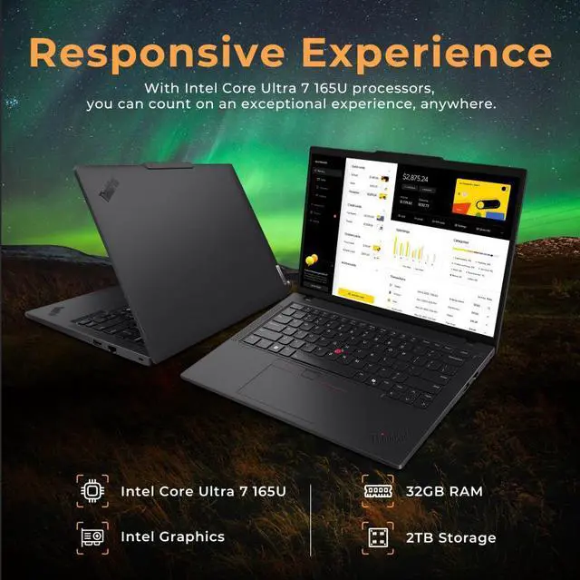 Lenovo ThinkPad T14 Gen 5 14" WUXGA Touchscreen Laptop delivers sleek, responsive performance with the Intel Core Ultra 7 165U processor, integrated Intel graphics, a backlit keyboard for secure, efficient productivity.
