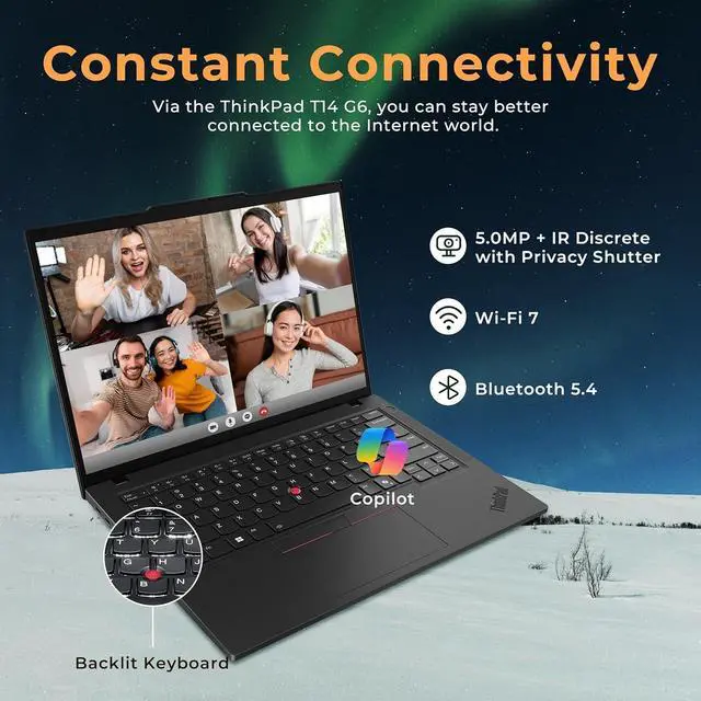 The Lenovo ThinkPad T14 Gen 6 14" WUXGA Laptop combines an AMD Ryzen AI 7 350 processor, AMD Radeon 860M Graphics, backlit keyboard, and Copilot+ PC in a professional business design.