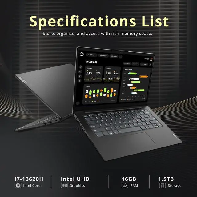 The Lenovo V14 G4 features a sharp 14" FHD display, powered by an Intel Core i7-13620H processor and Intel UHD Graphics, with a 720p HD camera for clear video conferencing.
