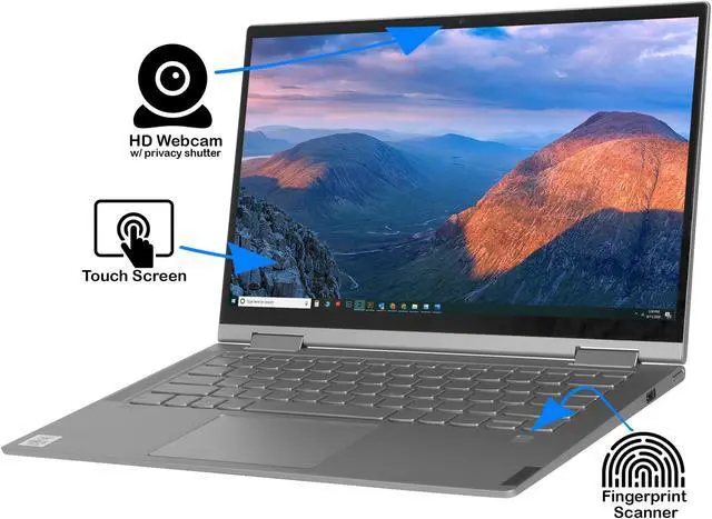 GENERAL INFORMATION Brand: Lenovo Series: Yoga Model: C740 Form Factor: 2-in-1 Convertible Operating System: Windows 10 Pro DISPLAY Display Size: 14" Resolution: FHD (1920 x 1080) Touch: Multi-touch Display Display Features: IPS Webcam: Yes - 720p PROCESSOR Processor Brand: Intel Processor Type: Core i5-10210U Number of Cores: 4 Base Frequency: 1.60GH z Turbo Frequency: 4.2GH z SmartCache: 6MB MEMORY Memory Capacity: 8GB (Soldered on board) Memory Type: DDR4 Memory Form Factor: SO-DIMM Memory Speed: 2400 Max Supported Memory: 8 GB STORAGE Drive Capacity: 512GB Drive Type: NVMe SSD (PCIe) VIDEO Integrated Graphics: Intel UHD Graphics AUDIO Audio Tech: Dolby Atmos Speakers: Stereo Speakers PORTS & FEATURES Video Ports: 1x DisplayPort via USB-C Audio Ports: 1 x Headphone/Microphone Combo Jack USB Ports: 1x USB 3.1 Gen 1, 2x USB-C 3.1 Gen 1 Fingerprint Reader: Yes Keyboard: Backlit COMMUNICATIONS Wi-Fi: Wi-Fi 5 ( 802.11 ac) Bluetooth: Bluetooth 5.0 POWER AC Adapter: 65-watt Battery: 4-cell lithium ion Battery Life: > 5 hours PHYSICAL SPECIFICATIONS Length: 8.4 in. Width: 12.7 in. Height: 0.7 in. Weight: 3.09 lbs Color: Gray