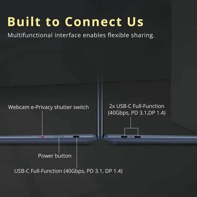 Windows 11 Home: 12.79" x 8.86" x 0.51", 2.82 lbs. Ports: 3x USB-C, 1x Webcam e-Privacy shutter switch, 1x Power Button. Wi-Fi 7 + Bluetooth 5.4. Bonus Docking Station Set: 1x 7-in-1 Docking Station w/ 1TB Storage, 1x 32GB MicroSD Card w/ Adapter, 1x Type-C Data Cable, 1x 3-in-1 Charging Cable, 1x Suede Cleaning Cloth.
