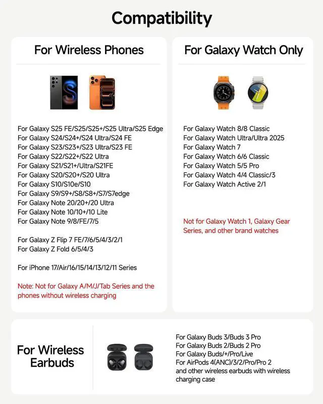 | Compatible Devices | for Galaxy Buds3 Pro/Galaxy Buds3/Galaxy Buds 2 Pro/Galaxy Buds Pro/Galaxy Buds/Galaxy Buds+/Galaxy Buds Live and all other support earbuds wireless charging case, for Samsung Galaxy Watch 8 Classic/Galaxy Watch 8/Galaxy watch 7/Galaxy watch Ultra/Galaxy watch 6/Galaxy watch 6 Classic/Galaxy Watch 5/Galaxy Watch 5 Pro/Galaxy Watch 4/4 Classic/Galaxy Watch Active 2/Active 1/Galaxy Watch 1/Galaxy Watch 3; |