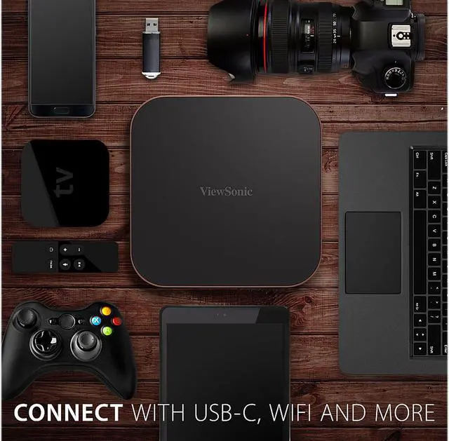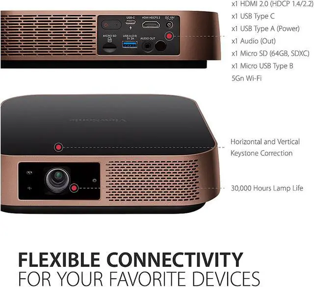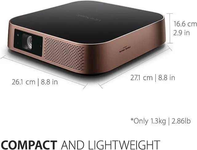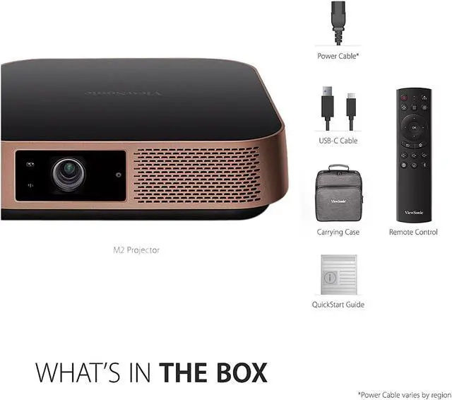 Ideal for business travelers on the go, the ViewSonic® M2 portable Full HD LED projector delivers power and performance in a portable package. Compact and lightweight, the ViewSonic M2 can be carried from office-to-office, or slipped into a briefcase or backpack and taken on the road. For convenient presentations and content sharing, a wireless screen mirroring feature allows users to easily cast content from a mobile device to the projector. The M2 projector features a shorter throw lens that can display large images in small spaces, while its LED light source provides over 30,000 hours* of usage time and 1,200 lumens of brightness. An adjustable kickstand design delivers simple and quick setup for easy projection in nearly any environment. An integrated Micro SD card slot and USB Type-A reader port allow users to display documents, videos, and other multimedia without having to connect to a PC. And for fast data, audio, video, and charging over a single cable, there’s a USB Type-C port. For more immersive multimedia presentations, dual Harman Kardon speakers deliver room-filling sound to keep audiences engaged.