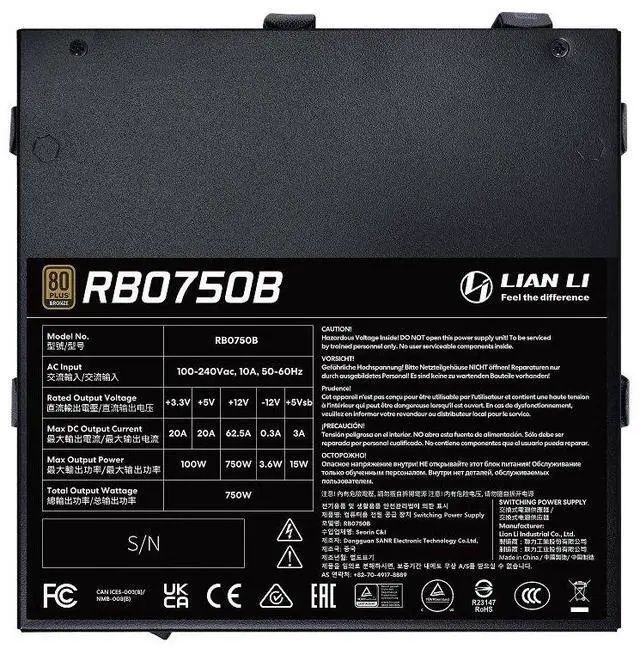 Lian Li RB750 80 Plus Bronze Non Modular - Low-Noise ATX 750 Watt Power Supply with 12+4Pin Connector - ATX 3.1 & PCIe 5.1 Compliant - Cable Management - 135mm Larger Fan - Black (RB0750B)