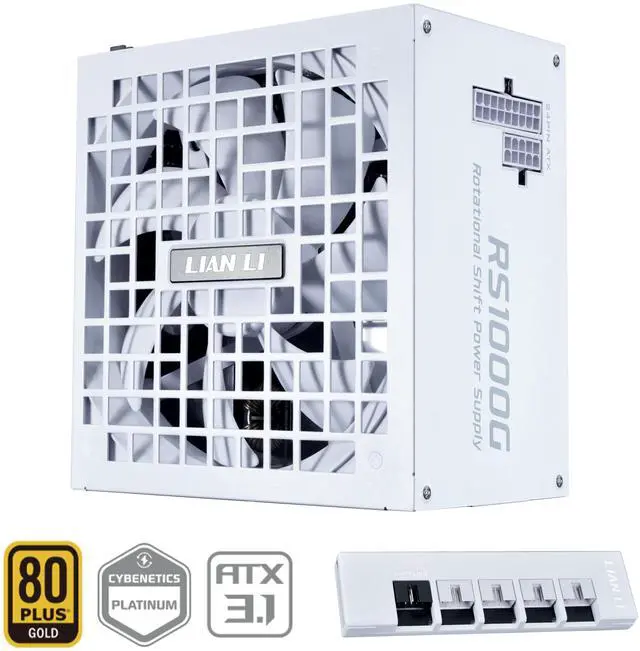 The LIAN LI RS Series PSU is a fully modular 1000W/1200W power supply featuring a unique rotatable AC input and dual-sided 24-pin outputs, allowing for cleaner cable routing in standard, and back-connect. Certified with 80 PLUS Gold, PPLP Gold, and Cybenetics Gold, it delivers reliable, energy-efficient performance. It includes optional integration with the RS HUB, a magnetic USB module, and features LIAN LIs custom 12V-2x6 cable with thicker, low-resistance terminals for improved safety. Built with premium EPCOS or equivalent Japanese capacitors, it offers stable power delivery, a silent 135mm FDB fan with fanless mode, and soft flat cables with magnetic ties for easy cable management backed by a 10-year warranty, and a 2-year warranty for the RS HUB.