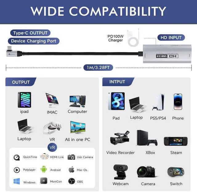 • [Wide Compatibility]Compatible with Quest 3/3s, iPad, Switch/Switch2, PS5/4, DSLR cameras, laptops, and more. Supports a wide range of capture software and platforms like OBS Studio, YouTube, Twitch, HDMI Link, MoniCon, QuickTime, and more. Works seamlessly with Windows 7/8/10/11, macOS, Linux, Android, and iPadOS 17+, ensuring exceptional performance across nearly all your devices