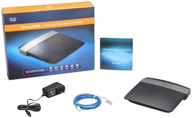 Linksys E2500 Advanced Dual-Band N Router CD-ROM with setup software and resources Ethernet network cable Power adapter