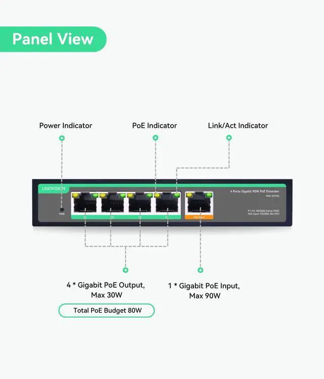 | PoE Output | 4*10/100/1000 Base-T RJ45 port; Compliant to IEEE802.3af/at standard; |