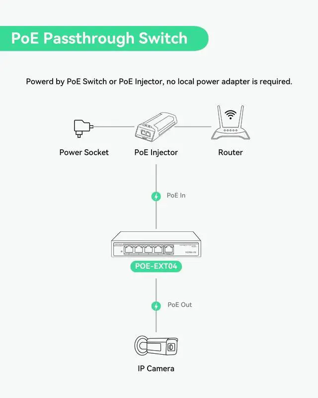 Powerd by PoE Switch or PoE Injector, passes PoE power to other PoE devices, such as VoIP phones and cameras. Also know as PoE Powed Switch. No local power adapter is required.