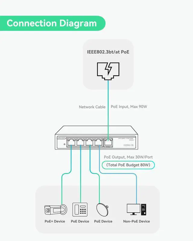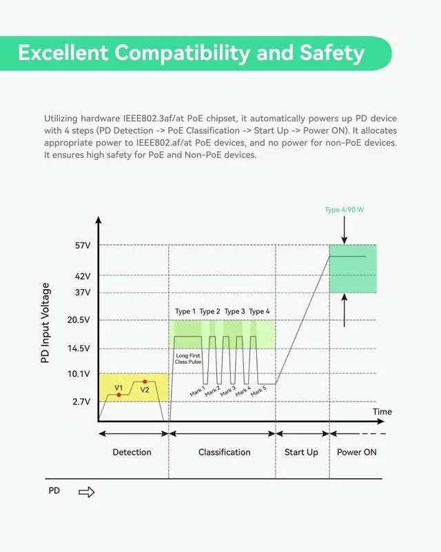 Using hardware IEEE802.3af/at PoE chipset, it automatically powers up PD device with 4 steps (PD Detection -> PoE Classification -> Start Up -> Power ON). It allocates appropriate power to IEEE802.af/at PoE devices, and no power for non-PoE devices. It ensures high safety for PoE and Non-PoE devices