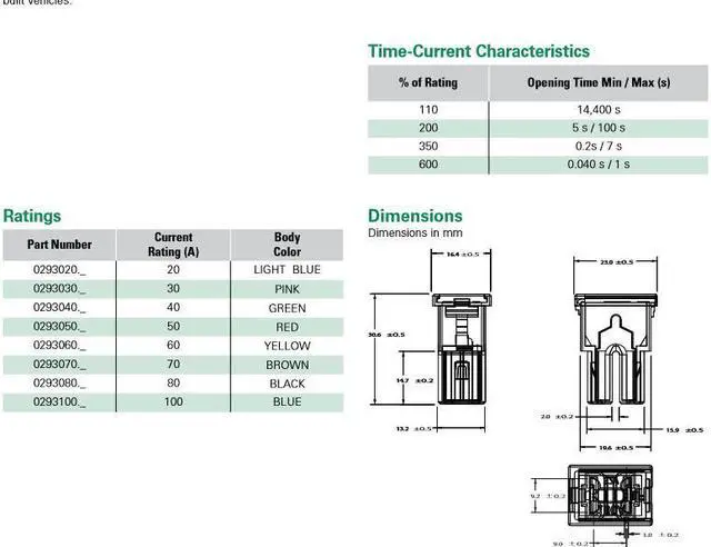 The fuses satisfy the performance requirements after 50% of the rated current is applied for 10,000 cycles. Each cycle consists of an interrupted current with the pattern of 5 minutes ON and 10 minutes OFF.