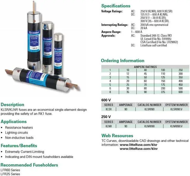 KLSR/KLNR fuses are an economical single element design providing the safety of an RK1 fuse.