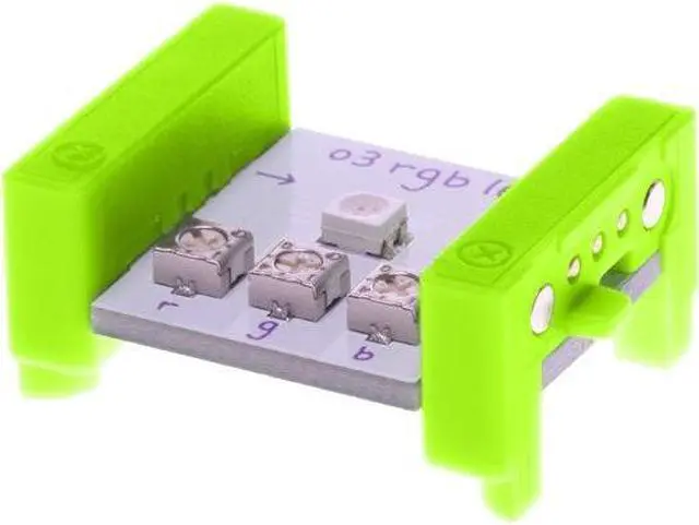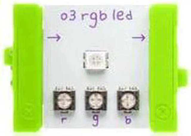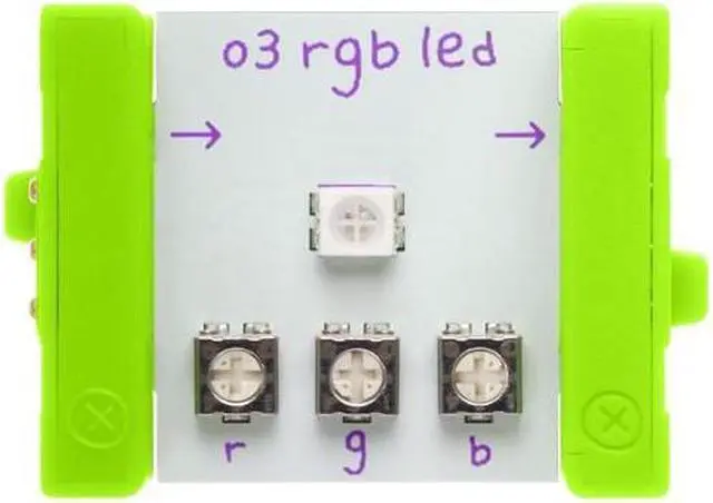 The RGB LED (or "Red-Green-Blue Light-Emitting Diode") Bit is a light with adjustable color. You can use the purple littleBits screwdriver to turn the dials and create your own custom color mix of red, green, and blue.