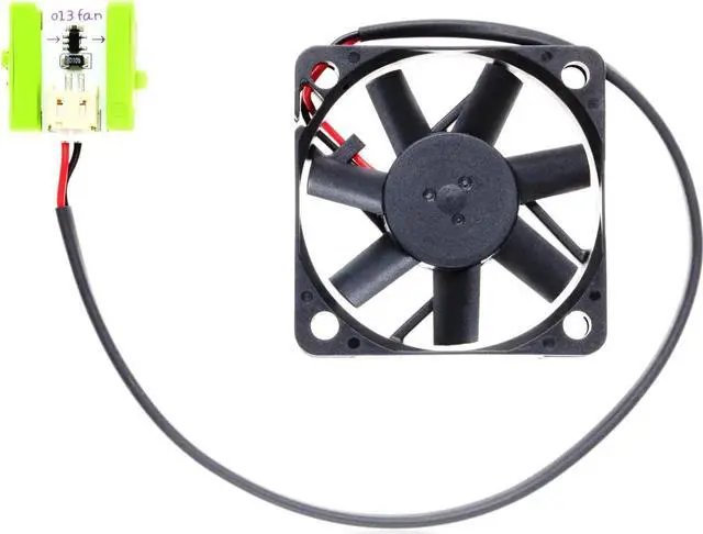 The fan Bit is a small electric fan tethered to a Bit. Use the fan to create a gentle breeze, perfect for cooling things off or blowing bubbles. You can also try taping small things (like stickers or pieces of paper) to the center of the fan for some spinning visuals.