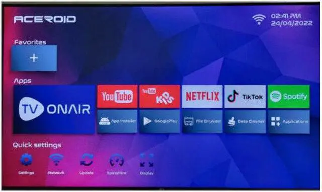 DIAMOND SpecificationFeatures· Android 11 TV system based· TVONAIR Streaming App built-in· 4Kx2k@60fps resolution· High performance memory chipset built-in· Dualband Mimo WiFi( 2.4G /5G) module built-in· Gigabit LAN interface built-in· LEVEL1 Widevine supported· Premium Bluetooth RCU with Voice Contro & Air mouse· AV1/HEVC/H. 265 technology supported· HDMI 2.1 Supported· User-friendly interface· Premium quality remote control unit· OTA update for both system and apps· Youtube/Netflix and more appsProcessor Quad core ARM Cortex-A55 CPUGPU G31 MP2 GPU processorOpenGL ES 3.2 Vulkan 1.1 and OpenCL 2.0RAM Memory 2GB DDR4Storage 16GB EmmcWiFi IEEE 802.11 b/g/n/ac, 2.4 g/5g dualband wifi with dual antennaEthernet IEEE 802.3 10/100/1000M Ethernet MACBluetooth Bluetooth 5.1H ousing