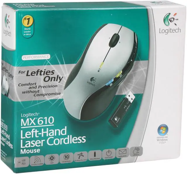 The one-touch buttons let you control your web experience with a fingertip, while volume controls adjust your media without taking your hand off the mouse. Email and IM Notification buttons give you easy access, and light up when a new email or IM is received. Thanks to Logitech's 2.4 GHz receiver, you get uninterrupted wireless performance, even in crowded wireless environments. The graceful swoop design of the left-handed MX610 laser mouse lets you work and play in comfort, all day or all night!