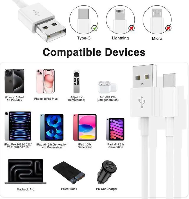 Compact and PortableThe 2 Pack 6 Feet/2M Carplay USB A to USB C Cable is a compact design that makes it easy to store in your car or carry with you on the go. It is ideal for charging your devices on the go. Universal Compatibility Perfect match with all USB A to USB C fast charger widely compatible with iPhone 16 iPhone 16 Pro iPhone 16 Plus iPhone 16 Pro Max iPhone 15 iPhone 15 Pro iPhone 15 Plus iPhone 15 Pro Max iPad Pro 12.9 inch 6th/5th/4th/3rd generation(2022/2021/2020/2018) iPad Pro 11 inch 4th 3rd Generation iPad Air 5th 4th iPad Mini 6 iPad 10 Galaxy S24/S24+/S24 Ultra/S23/S23+/S23 Ultra/S22/S21/S20/S10 Google Pixel 7 Pro/7/6a/6 Pro/6 and other USB-C device.