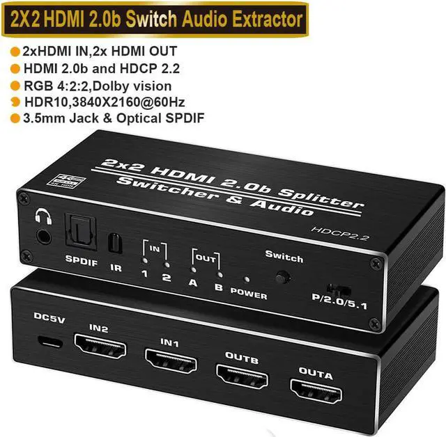 HDMI Switch Splitter 2x2 with Audio Extractor, 4K@60Hz Ultra HD HDMI Switcher with Optical TOSLINK SPDIF, 3.5mm Audio Support HDCP 2.2, HDMI2.0b, 4K@60HZ, RGB4:2:2, 4K HDR , Remote Control