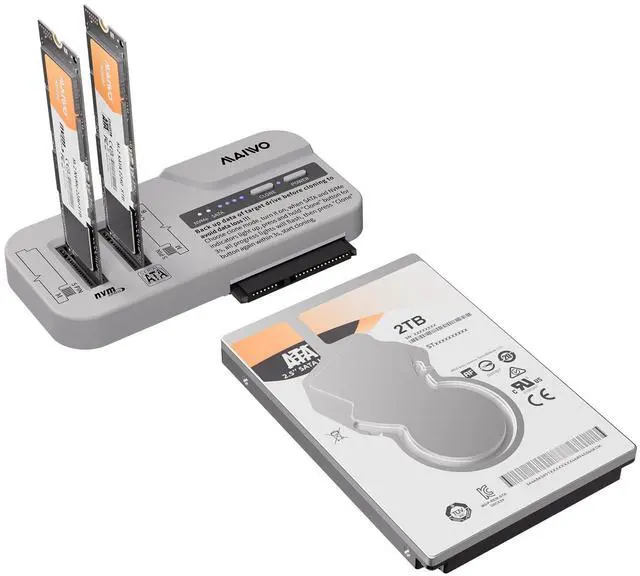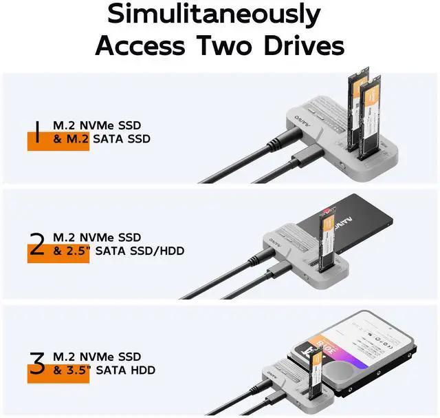 Simultaneously Access Two DrivesThis SATA SSD/HDD to M.2 NVMe USB-C Clone Station can recognize two hard drives at the same time when you connect enclosure to computerM.2 NVMe SSD and one of SATA protocol drives.