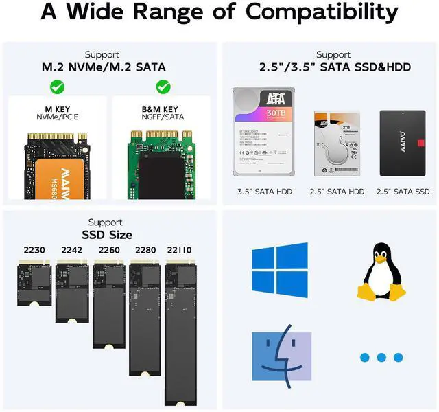 Extensive CompatibilityThis USB-C hard drive reader is compatible with M.2 NVMe & M.2 SATA & 2.5/3.5 inch SATA SSDs/HDDs. One reader for most of your hard drives, as a multifunctional hard disk docking station, it can read and write data, backup data, migrate data and upgrade hdd to a new fast ssd.