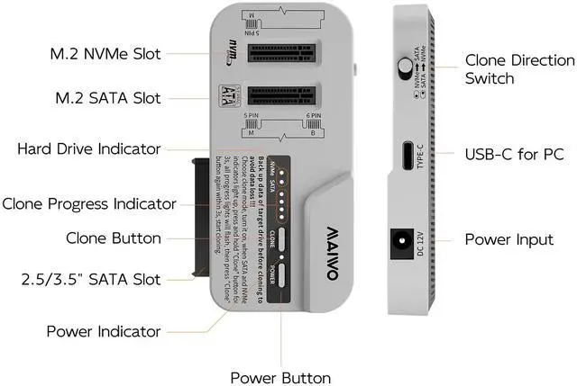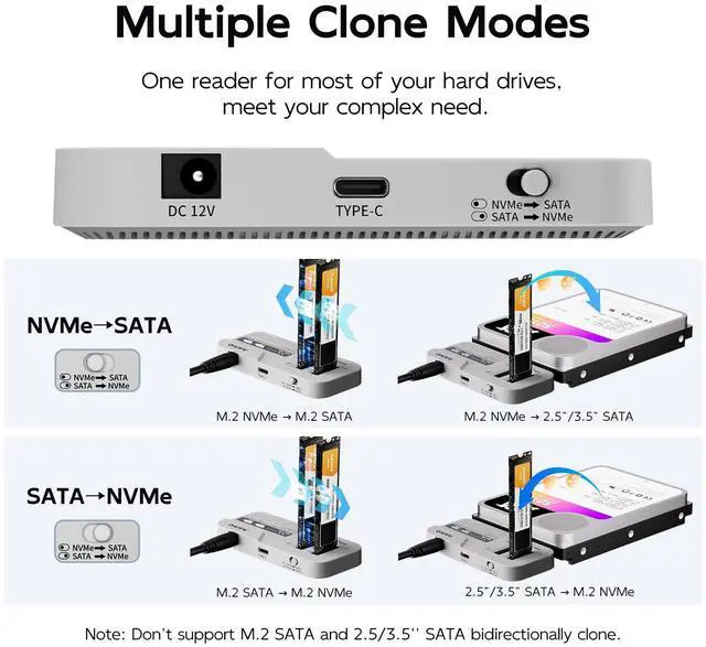 Bidirectional Offline CloneThis M.2 NVMe to SATA cloner supports multiple clone function: M.2 NVMe M.2 SATA; M.2 NVMe 2.5/3.5 SATA. Using one docking station, meet your complex need. Easily create exact, bit-by-bit copies of your drives without computer or any software and driver.Dont support M.2 SATA 2.5/3.5 SATA