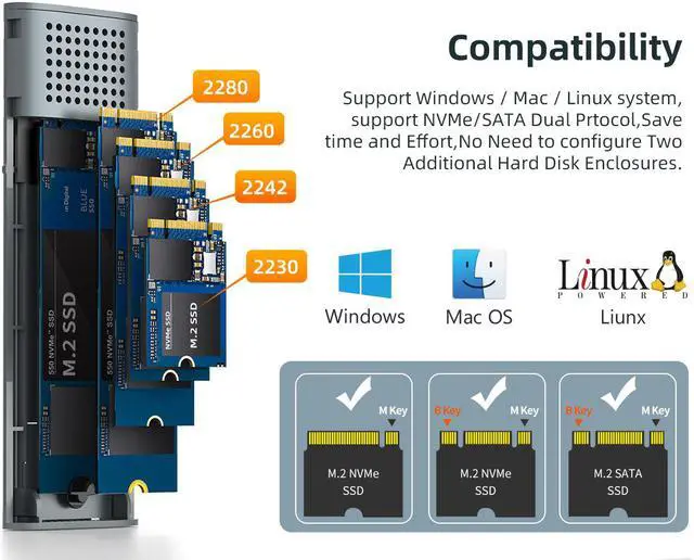 - Compatible with M.2 2230/2242/2260/2280 SSD