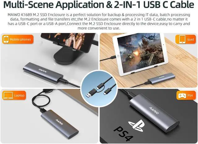 This M.2 SSD Hard Drive Reader/Adapter work with multi devices such as laptop,desktop,smartphone/Tablets(with OTG function),PS4, smart routers etc.