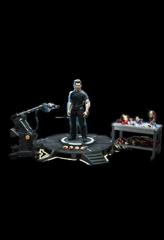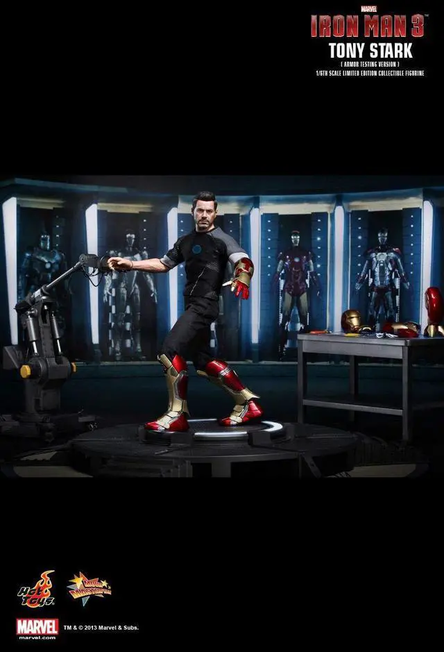 Hot Toys presents the newest addition to their Iron Man collection, the Tony Stark with Arc Reactor Creation Accessories Sixth Scale Set. In Marvel‘s Iron Man 2, Tony Stark was being slowly poisoned by the palladium Arc Reactor in his body. But with the help of the information left by Howard Stark, he re-discovered and created a new element by using a particle accelerator for use in a new Arc Reactor. This collectible set includes a specially crafted collectible figure based on the image of Robert Downey Jr. as the genius billionaire Tony Stark in Iron Man 2, advanced body with light-up chest light, tailored outfit, the Captain America shield prototype which he has used to level the particle accelerator, and tons of workshop accessories. Lab accessories include one (1) Captain America shield prototype, one (1) arc reactor, one (1) arc reactor core holder, one (1) pair of goggles, and two (2) blueprints. Figure comes complete with a display stand with Tony Stark nameplate and the movie logo.