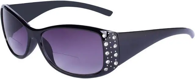 This trendy look gets an update with a bold design featuring rhinestones on the edge of the frame, molded for comfort. High quality polycarbonate lenses as well as reinforced lightweight frames help sharpen your vision. Women's fashion bifocal sunglasses are great for driving, the beach, a good book poolside and many more outdoor activities. Get a classic and comfortable look while wearing rhinestone bifocal sunglasses!