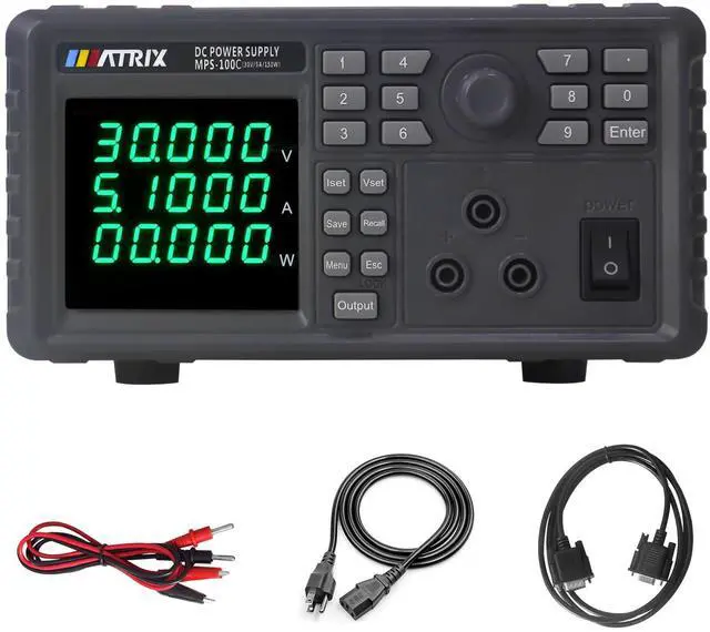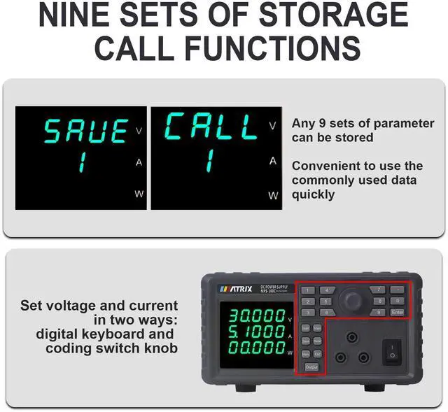 MPS-100 Series programmable DC power supply with low ripple and noise, 1mV/0.1mA high resolution, 9 sets of preset storage, single machine List sequence programming, LED display brightness adjustable, capable of monitoring the internal temperature, and optional RS-232+485 communication interface.
