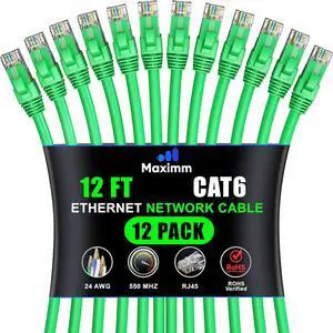 Maximm Cat 6 Ethernet Cable 12 ft (12-Pack) - High-Speed LAN Cable, Internet Cable, Patch Cable, and Network Cable - UTP, 10Gbps, 550MHz Ethernet Cord - Green