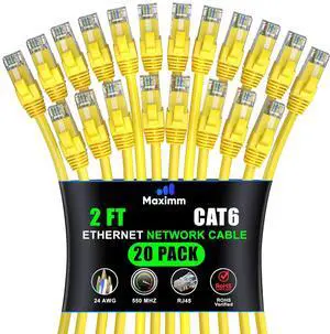 Maximm Cat 6 Ethernet Cable 2 ft (20-Pack) - High-Speed LAN Cable, Internet Cable, Patch Cable, and Network Cable - UTP, 10Gbps, 550MHz Ethernet Cord - Yellow