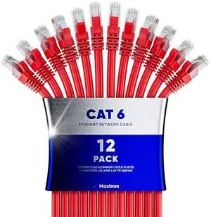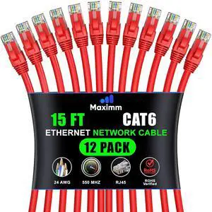 Maximm Cat 6 Ethernet Cable 15 Ft, (12-Pack) Cat6 Cable, LAN Cable, Internet Cable and Network Cable - UTP (Red)