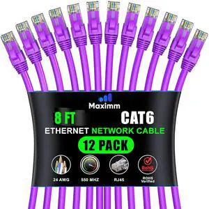 Maximm Cat 6 Ethernet Cable 8 ft 12 Pack - High-Speed LAN Cable, Internet Cable, Patch Cable, and Network Cable - UTP, 10Gbps, 550MHz Ethernet Cord - Purple