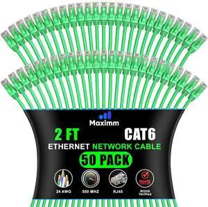 Maximm Cat 6 Ethernet Cable 2 ft (50-Pack) - High-Speed LAN Cable, Internet Cable, Patch Cable, and Network Cable - UTP, 10Gbps, 550MHz Ethernet Cord - Green