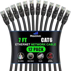 Maximm Cat 6 Ethernet Cable - 7 ft (12-Pack), High-Speed LAN, Internet, Patch, and Network Cable - UTP, 10Gbps, 550MHz Ethernet Cord - Black