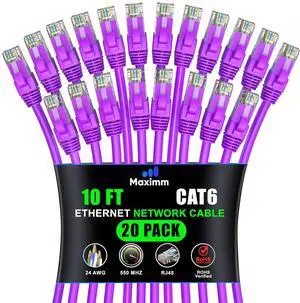 Maximm Cat 6 Ethernet Cable 10 ft (20-Pack) - High-Speed LAN Cable, Internet Cable, Patch Cable, and Network Cable - UTP, 10Gbps, 550MHz Ethernet Cord - Purple