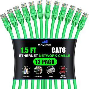 Maximm Cat 6 Ethernet Cable 1.5 Ft, (12-Pack) Cat6 Cable, LAN Cable, Internet Cable, Patch Cable and Network Cable - UTP (Green) 1.5 Feet