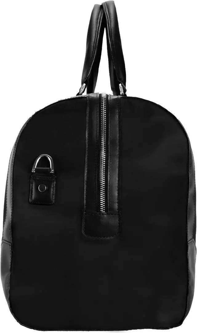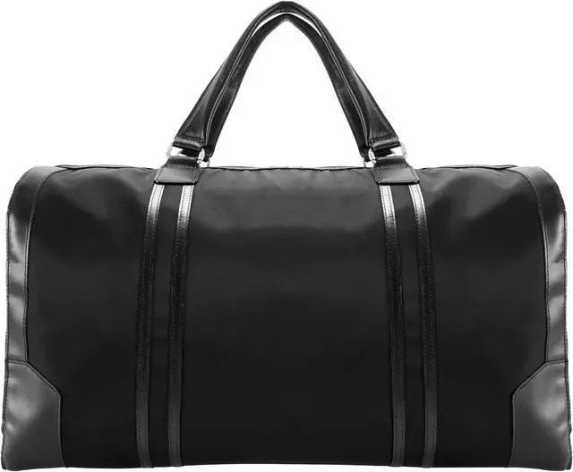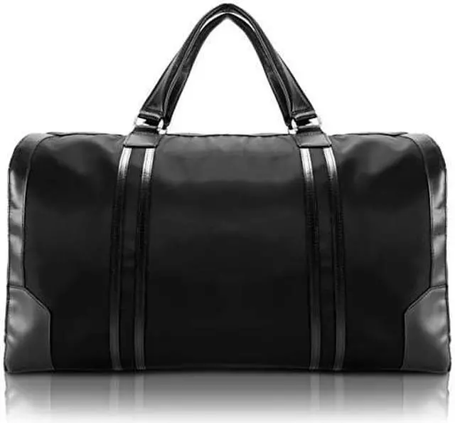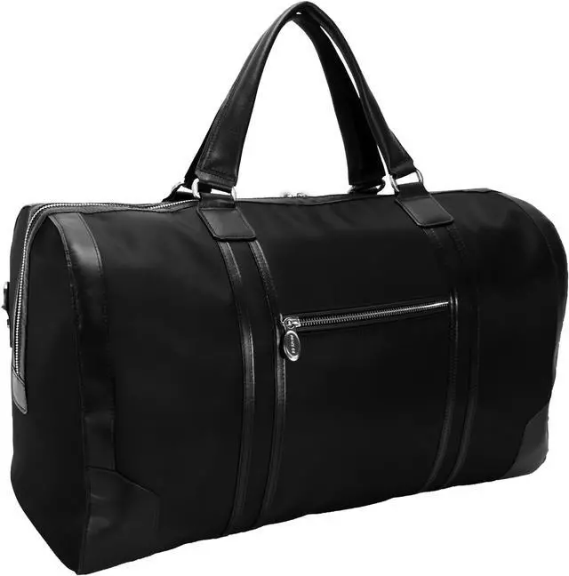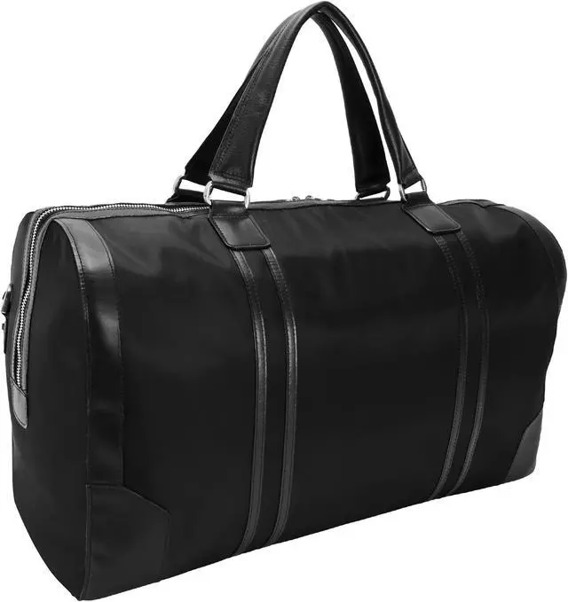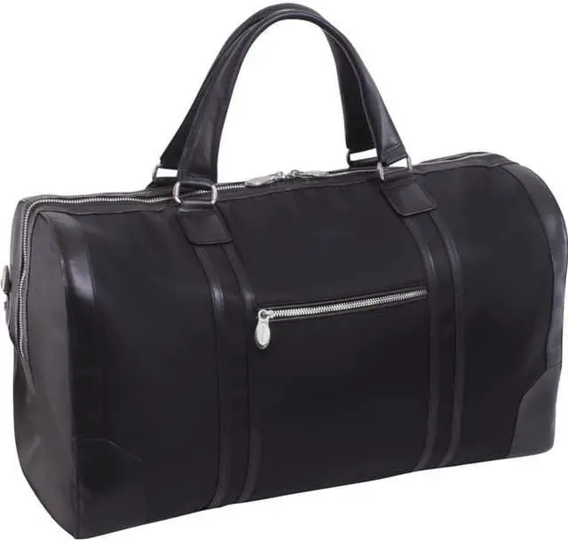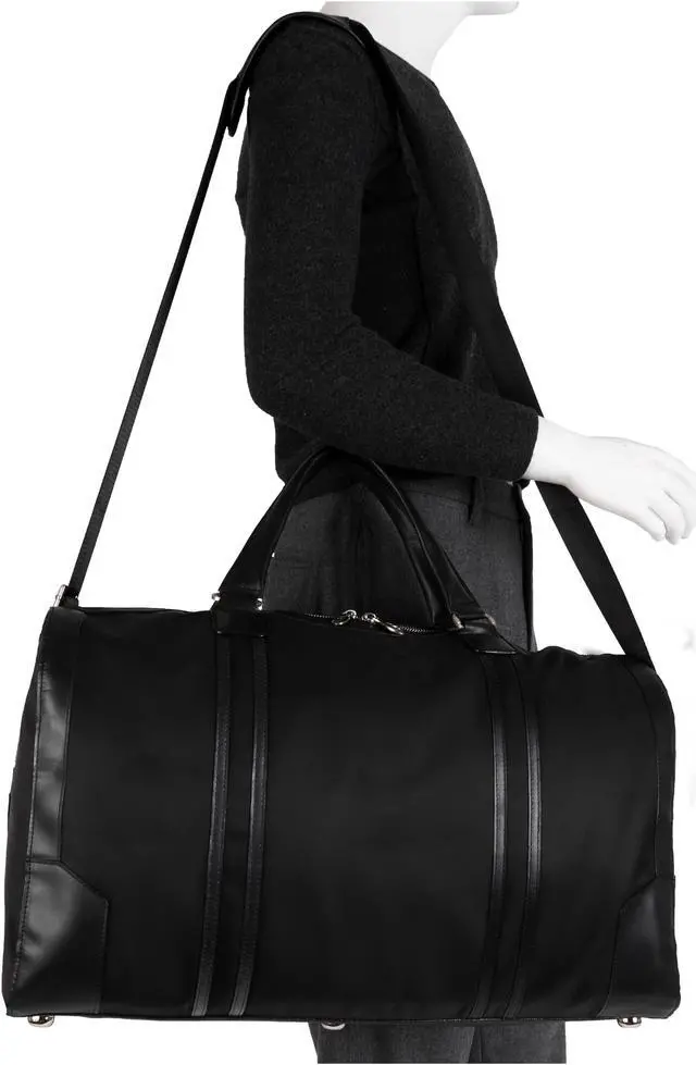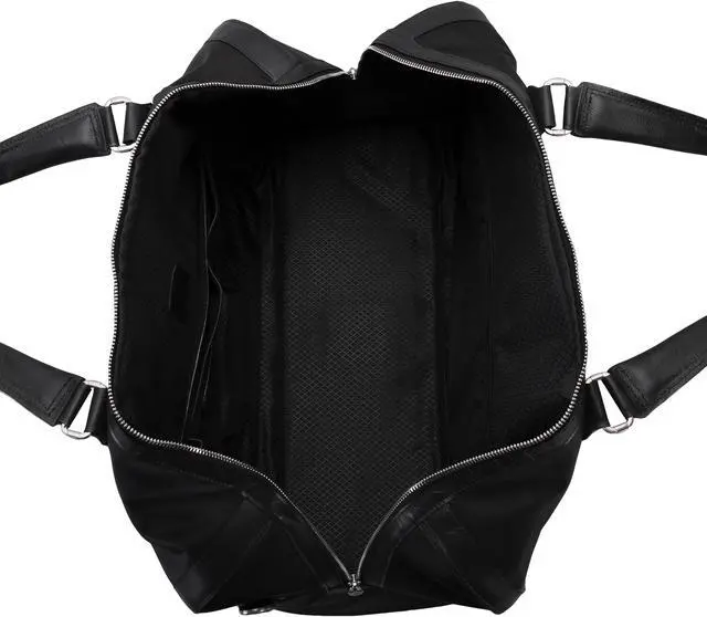 Spacious Nylon duffel with leather accents fully-lined interior with leather accents. Interior tablet pocket with organizer for business cards, pens, and accessories. Interior secure zipper pocket with organizer for accessories. Silver accent hardware and metal zippers. External easy access back zipper pocket. Removable and adjustable nylon strap with leather shoulder pad.