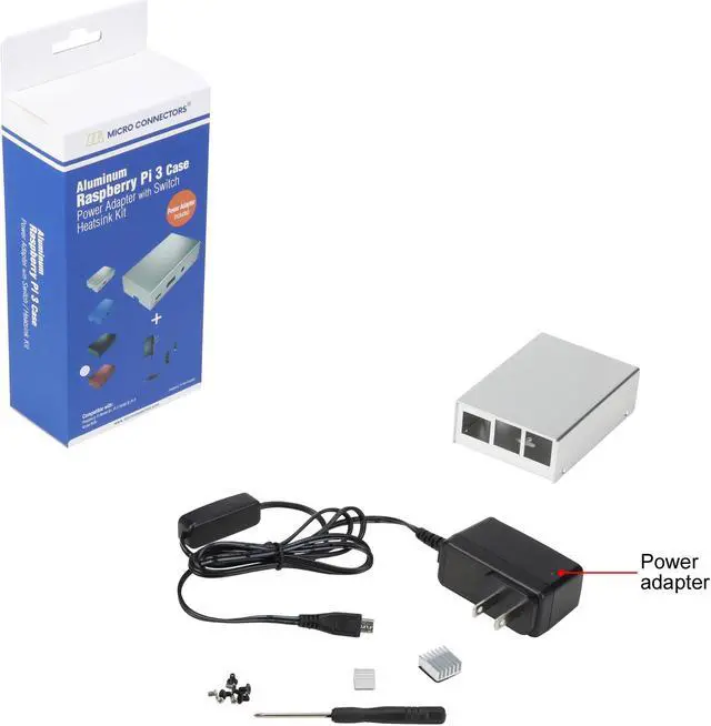| Features | Case: Compatible with Raspberry Pi 1 Model B+, Pi 2 Model B, Pi 3 Model B/B+ Quality and durable aluminum casing to dissipate heat Precision-cut casing allows easy access to all ports Heat sink kits included for cooling Wall mount compatible Anti-slip rubber feet pads Power Adapter: UL and FCC Approved Convenient ON/OFF Switch DoE Level VI Efficiency Over Circuit Protection Short Circuit Protection Compatible with all Raspberry Pi Micro-USB connector Input: AC 100-240V/50-60Hz Output: DC 5V/2.5A Cable length: 47 inches (3.9 feet) Weight: 0.25 lb. |