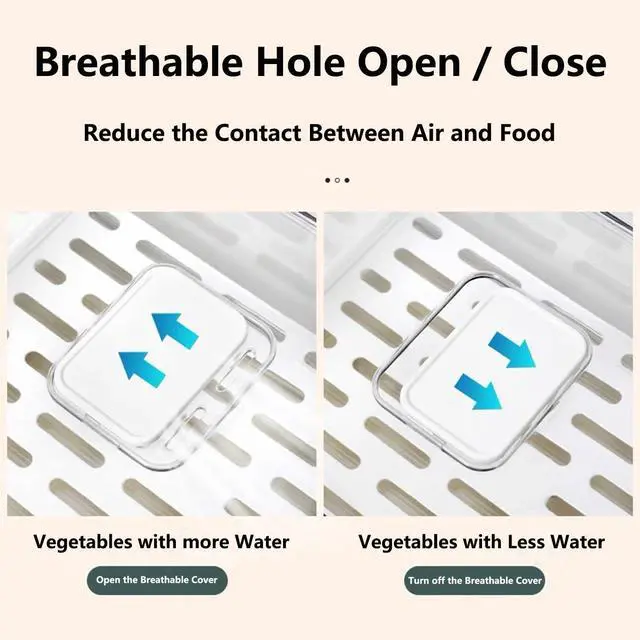 There is an ventilation holes at the top of the outer box of the fridge organizers and storage bins which can keep the food more fresh. Fruits and vegetables with a lot of water, Open the ventilation holes. Fruits and vegetables with a less of water, Turn off the ventilation holes. Keep the original taste of food.