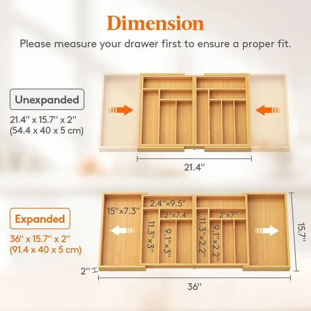 Before purchasing, please measure your drawer for the ideal fit. Our organizer fully expands to 36" × 15.7" × 2" (91.4 x 40 x 5 cm) and folds down to 21.4" × 15.7" × 2" (54.4 x 40 x 5 cm). It can also be split into two individual organizers for smaller drawers.