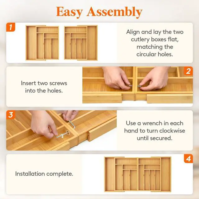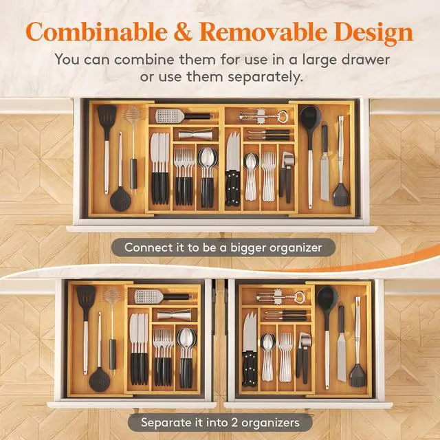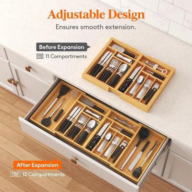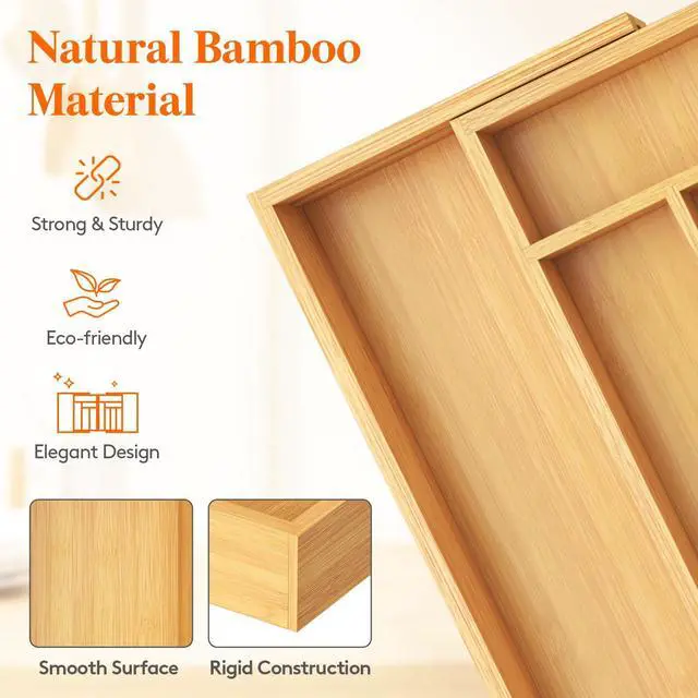 Our cutlery organizer is made from bamboo, offering exceptional strength and crack resistance. Its smooth surface, elegant texture, and warm tone enhance any drawer or kitchen decor.