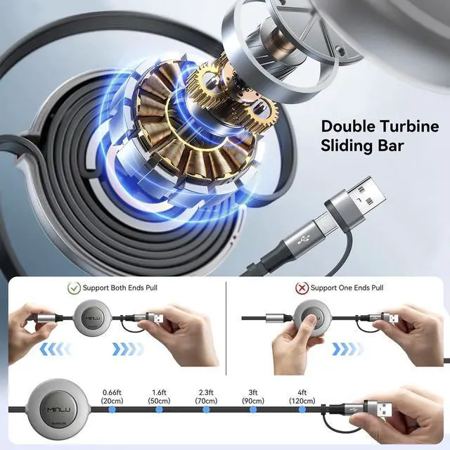 ? 4Ft/120cm is perfect length for long distance charging, 4-in-2 retractable design, makes the cord portable and only need one cable when you are on a business trip or traveling.